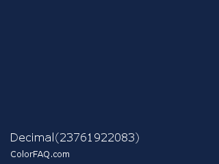 Decimal 23761922083 Color is a very dark blue color and the nearest color is Blue Zodiac #13264d. Hex code #142547 and RGB value is rgb(20,37,71). In RGB color space, this color is composed of 8% red, 15% green, 28% blue, In CMYK color space, this color is composed of 72% cyan, 48% magenta, 0% yellow , 72% black , In HSL color space, this color has a hue angle of 220° , 56% saturation and 18% lightness.