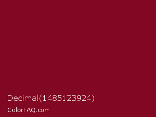 Decimal 1485123924 Color is a dark red color and the nearest color is Burgundy #800020. Hex code #820722 and RGB value is rgb(130,7,34). In RGB color space, this color is composed of 51% red, 3% green, 13% blue, In CMYK color space, this color is composed of 0% cyan, 95% magenta, 74% yellow , 49% black , In HSL color space, this color has a hue angle of 347° , 90% saturation and 27% lightness.
