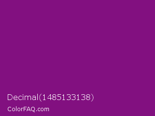 Decimal 1485133138 Color is a dark magenta color and the nearest color is Patriarch #800080. Hex code #821080 and RGB value is rgb(130,16,128). In RGB color space, this color is composed of 51% red, 6% green, 50% blue, In CMYK color space, this color is composed of 0% cyan, 88% magenta, 2% yellow , 49% black , In HSL color space, this color has a hue angle of 301° , 78% saturation and 29% lightness.