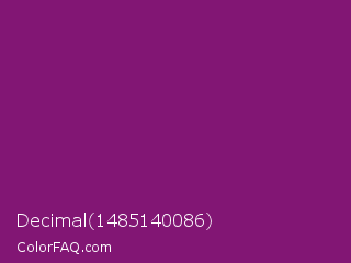 Decimal 1485140086 Color is a dark magenta color and the nearest color is Midnight #702670. Hex code #821674 and RGB value is rgb(130,22,116). In RGB color space, this color is composed of 51% red, 9% green, 45% blue, In CMYK color space, this color is composed of 0% cyan, 83% magenta, 11% yellow , 49% black , In HSL color space, this color has a hue angle of 308° , 71% saturation and 30% lightness.