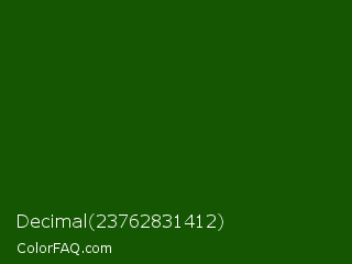 Decimal 23762831412 Color is a very dark green color and the nearest color is Lincoln Green #195905. Hex code #155602 and RGB value is rgb(21,86,2). In RGB color space, this color is composed of 8% red, 34% green, 1% blue, In CMYK color space, this color is composed of 76% cyan, 0% magenta, 98% yellow , 66% black , In HSL color space, this color has a hue angle of 106° , 95% saturation and 17% lightness.