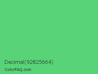 Decimal 92825664 Color is a normal green color and the nearest color is Emerald #50c878. Hex code #59d378 and RGB value is rgb(89,211,120). In RGB color space, this color is composed of 35% red, 83% green, 47% blue, In CMYK color space, this color is composed of 58% cyan, 0% magenta, 43% yellow , 17% black , In HSL color space, this color has a hue angle of 135° , 58% saturation and 59% lightness.