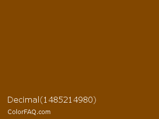 Decimal 1485214980 Color is a dark orange color and the nearest color is Cinnamon #7b3f00. Hex code #824700 and RGB value is rgb(130,71,0). In RGB color space, this color is composed of 51% red, 28% green, 0% blue, In CMYK color space, this color is composed of 0% cyan, 45% magenta, 100% yellow , 49% black , In HSL color space, this color has a hue angle of 33° , 100% saturation and 25% lightness.
