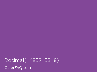 Decimal 1485215318 Color is a normal purple color and the nearest color is Dark Lavender #734f96. Hex code #824798 and RGB value is rgb(130,71,152). In RGB color space, this color is composed of 51% red, 28% green, 60% blue, In CMYK color space, this color is composed of 14% cyan, 53% magenta, 0% yellow , 40% black , In HSL color space, this color has a hue angle of 284° , 36% saturation and 44% lightness.