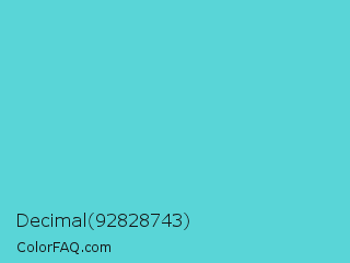 Decimal 92828743 Color is a normal cyan color and the nearest color is Viking #64ccdb. Hex code #59d5d7 and RGB value is rgb(89,213,215). In RGB color space, this color is composed of 35% red, 84% green, 84% blue, In CMYK color space, this color is composed of 59% cyan, 1% magenta, 0% yellow , 16% black , In HSL color space, this color has a hue angle of 181° , 61% saturation and 60% lightness.