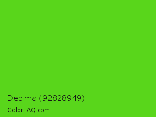 Decimal 92828949 Color is a normal green color and the nearest color is Harlequin Green #46cb18. Hex code #59d61b and RGB value is rgb(89,214,27). In RGB color space, this color is composed of 35% red, 84% green, 11% blue, In CMYK color space, this color is composed of 58% cyan, 0% magenta, 87% yellow , 16% black , In HSL color space, this color has a hue angle of 100° , 78% saturation and 47% lightness.