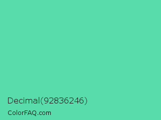 Decimal 92836246 Color is a light green color and the nearest color is Medium Aquamarine #66ddaa. Hex code #59dcac and RGB value is rgb(89,220,172). In RGB color space, this color is composed of 35% red, 86% green, 67% blue, In CMYK color space, this color is composed of 60% cyan, 0% magenta, 22% yellow , 14% black , In HSL color space, this color has a hue angle of 158° , 65% saturation and 61% lightness.