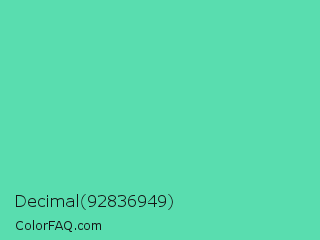 Decimal 92836949 Color is a light green color and the nearest color is Medium Aquamarine #66ddaa. Hex code #59ddaf and RGB value is rgb(89,221,175). In RGB color space, this color is composed of 35% red, 87% green, 69% blue, In CMYK color space, this color is composed of 60% cyan, 0% magenta, 21% yellow , 13% black , In HSL color space, this color has a hue angle of 159° , 66% saturation and 61% lightness.
