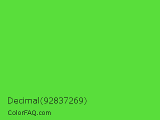 Decimal 92837269 Color is a normal green color and the nearest color is Lime Green #32cd32. Hex code #59de3b and RGB value is rgb(89,222,59). In RGB color space, this color is composed of 35% red, 87% green, 23% blue, In CMYK color space, this color is composed of 60% cyan, 0% magenta, 73% yellow , 13% black , In HSL color space, this color has a hue angle of 109° , 71% saturation and 55% lightness.