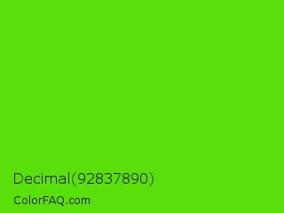 Decimal 92837890 Color is a normal green color and the nearest color is Harlequin Green #46cb18. Hex code #59df0a and RGB value is rgb(89,223,10). In RGB color space, this color is composed of 35% red, 87% green, 4% blue, In CMYK color space, this color is composed of 60% cyan, 0% magenta, 96% yellow , 13% black , In HSL color space, this color has a hue angle of 98° , 91% saturation and 46% lightness.