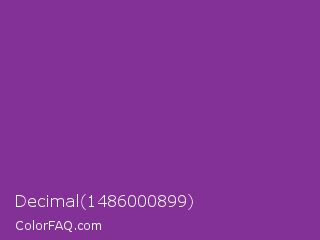 Decimal 1486000899 Color is a normal purple color and the nearest color is Vivid Violet #803790. Hex code #833097 and RGB value is rgb(131,48,151). In RGB color space, this color is composed of 51% red, 19% green, 59% blue, In CMYK color space, this color is composed of 13% cyan, 68% magenta, 0% yellow , 41% black , In HSL color space, this color has a hue angle of 288° , 52% saturation and 39% lightness.
