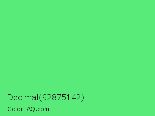 Decimal 92875142 Color is a light green color and the nearest color is Very Light Malachite Green #64e986. Hex code #59eb7a and RGB value is rgb(89,235,122). In RGB color space, this color is composed of 35% red, 92% green, 48% blue, In CMYK color space, this color is composed of 62% cyan, 0% magenta, 48% yellow , 8% black , In HSL color space, this color has a hue angle of 134° , 78% saturation and 64% lightness.