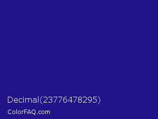 Decimal 23776478295 Color is a dark indigo color and the nearest color is Blue Gem #2c0e8c. Hex code #201289 and RGB value is rgb(32,18,137). In RGB color space, this color is composed of 13% red, 7% green, 54% blue, In CMYK color space, this color is composed of 77% cyan, 87% magenta, 0% yellow , 46% black , In HSL color space, this color has a hue angle of 247° , 77% saturation and 30% lightness.