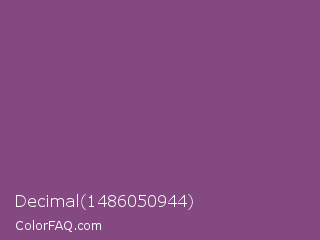 Decimal 1486050944 Color is a normal magenta color and the nearest color is Razzmic Berry #8d4e85. Hex code #834980 and RGB value is rgb(131,73,128). In RGB color space, this color is composed of 51% red, 29% green, 50% blue, In CMYK color space, this color is composed of 0% cyan, 44% magenta, 2% yellow , 49% black , In HSL color space, this color has a hue angle of 303° , 28% saturation and 40% lightness.