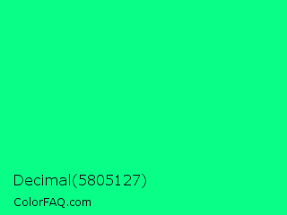 Decimal 5805127 Color is a normal green color and the nearest color is Spring Green #00ff7f. Hex code #08fe87 and RGB value is rgb(8,254,135). In RGB color space, this color is composed of 3% red, 100% green, 53% blue, In CMYK color space, this color is composed of 97% cyan, 0% magenta, 47% yellow , 0% black , In HSL color space, this color has a hue angle of 151° , 99% saturation and 51% lightness.