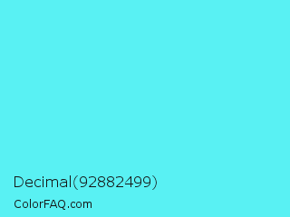 Decimal 92882499 Color is a light cyan color and the nearest color is Turquoise Blue #6cdae7. Hex code #59f1f3 and RGB value is rgb(89,241,243). In RGB color space, this color is composed of 35% red, 95% green, 95% blue, In CMYK color space, this color is composed of 63% cyan, 1% magenta, 0% yellow , 5% black , In HSL color space, this color has a hue angle of 181° , 87% saturation and 65% lightness.