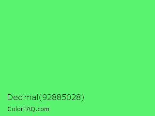 Decimal 92885028 Color is a light green color and the nearest color is Screamin Green #66ff66. Hex code #59f370 and RGB value is rgb(89,243,112). In RGB color space, this color is composed of 35% red, 95% green, 44% blue, In CMYK color space, this color is composed of 63% cyan, 0% magenta, 54% yellow , 5% black , In HSL color space, this color has a hue angle of 129° , 87% saturation and 65% lightness.