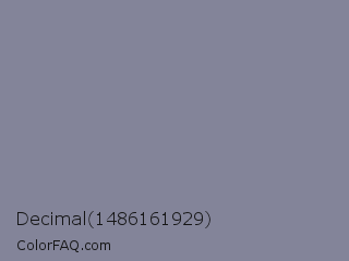 Decimal 1486161929 Color is a normal blue color and the nearest color is Roman Silver #838996. Hex code #838499 and RGB value is rgb(131,132,153). In RGB color space, this color is composed of 51% red, 52% green, 60% blue, In CMYK color space, this color is composed of 14% cyan, 14% magenta, 0% yellow , 40% black , In HSL color space, this color has a hue angle of 237° , 10% saturation and 56% lightness.