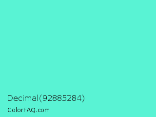 Decimal 92885284 Color is a light cyan color and the nearest color is Turquoise #40e0d0. Hex code #59f3d4 and RGB value is rgb(89,243,212). In RGB color space, this color is composed of 35% red, 95% green, 83% blue, In CMYK color space, this color is composed of 63% cyan, 0% magenta, 13% yellow , 5% black , In HSL color space, this color has a hue angle of 168° , 87% saturation and 65% lightness.