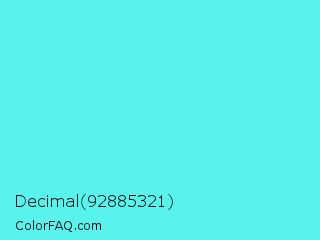 Decimal 92885321 Color is a light cyan color and the nearest color is Turquoise Blue #6cdae7. Hex code #59f3ed and RGB value is rgb(89,243,237). In RGB color space, this color is composed of 35% red, 95% green, 93% blue, In CMYK color space, this color is composed of 63% cyan, 0% magenta, 2% yellow , 5% black , In HSL color space, this color has a hue angle of 178° , 87% saturation and 65% lightness.