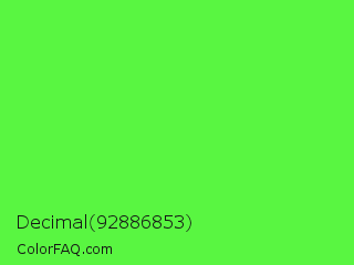 Decimal 92886853 Color is a light green color and the nearest color is Screamin Green #66ff66. Hex code #59f641 and RGB value is rgb(89,246,65). In RGB color space, this color is composed of 35% red, 96% green, 25% blue, In CMYK color space, this color is composed of 64% cyan, 0% magenta, 74% yellow , 4% black , In HSL color space, this color has a hue angle of 112° , 91% saturation and 61% lightness.
