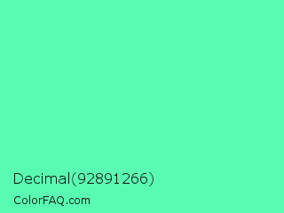 Decimal 92891266 Color is a light green color and the nearest color is Medium Aquamarine #66ddaa. Hex code #59fab2 and RGB value is rgb(89,250,178). In RGB color space, this color is composed of 35% red, 98% green, 70% blue, In CMYK color space, this color is composed of 64% cyan, 0% magenta, 29% yellow , 2% black , In HSL color space, this color has a hue angle of 153° , 94% saturation and 66% lightness.