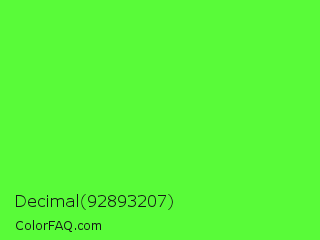 Decimal 92893207 Color is a normal green color and the nearest color is Screamin Green #66ff66. Hex code #59fb39 and RGB value is rgb(89,251,57). In RGB color space, this color is composed of 35% red, 98% green, 22% blue, In CMYK color space, this color is composed of 65% cyan, 0% magenta, 77% yellow , 2% black , In HSL color space, this color has a hue angle of 110° , 96% saturation and 60% lightness.