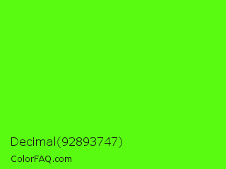 Decimal 92893747 Color is a normal green color and the nearest color is Bright Green #66ff00. Hex code #59fc11 and RGB value is rgb(89,252,17). In RGB color space, this color is composed of 35% red, 99% green, 7% blue, In CMYK color space, this color is composed of 65% cyan, 0% magenta, 93% yellow , 1% black , In HSL color space, this color has a hue angle of 102° , 98% saturation and 53% lightness.