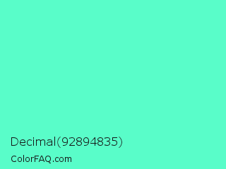 Decimal 92894835 Color is a light green color and the nearest color is Turquoise #40e0d0. Hex code #59fdc9 and RGB value is rgb(89,253,201). In RGB color space, this color is composed of 35% red, 99% green, 79% blue, In CMYK color space, this color is composed of 65% cyan, 0% magenta, 21% yellow , 1% black , In HSL color space, this color has a hue angle of 161° , 98% saturation and 67% lightness.