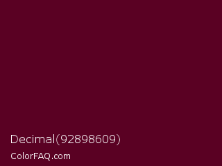 Decimal 92898609 Color is a very dark rose color and the nearest color is Bordeaux #5c0120. Hex code #5a0123 and RGB value is rgb(90,1,35). In RGB color space, this color is composed of 35% red, 0% green, 14% blue, In CMYK color space, this color is composed of 0% cyan, 99% magenta, 61% yellow , 65% black , In HSL color space, this color has a hue angle of 337° , 98% saturation and 18% lightness.