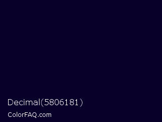 Decimal 5806181 Color is a almost black indigo color and the nearest color is Black Rock #0d0332. Hex code #090029 and RGB value is rgb(9,0,41). In RGB color space, this color is composed of 4% red, 0% green, 16% blue, In CMYK color space, this color is composed of 78% cyan, 100% magenta, 0% yellow , 84% black , In HSL color space, this color has a hue angle of 253° , 100% saturation and 8% lightness.