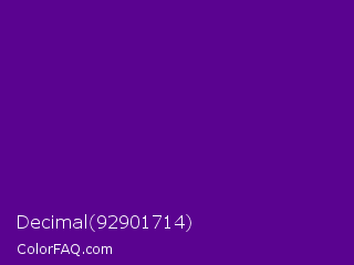 Decimal 92901714 Color is a dark purple color and the nearest color is Purple #660099. Hex code #5a0390 and RGB value is rgb(90,3,144). In RGB color space, this color is composed of 35% red, 1% green, 56% blue, In CMYK color space, this color is composed of 38% cyan, 98% magenta, 0% yellow , 44% black , In HSL color space, this color has a hue angle of 277° , 96% saturation and 29% lightness.