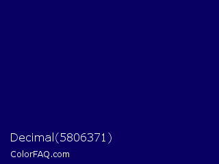 Decimal 5806371 Color is a very dark indigo color and the nearest color is Arapawa #110c6c. Hex code #090063 and RGB value is rgb(9,0,99). In RGB color space, this color is composed of 4% red, 0% green, 39% blue, In CMYK color space, this color is composed of 91% cyan, 100% magenta, 0% yellow , 61% black , In HSL color space, this color has a hue angle of 245° , 100% saturation and 19% lightness.