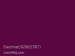 Decimal 92902787 Color is a very dark magenta color and the nearest color is Mulberry Wood #5c0536. Hex code #5a053f and RGB value is rgb(90,5,63). In RGB color space, this color is composed of 35% red, 2% green, 25% blue, In CMYK color space, this color is composed of 0% cyan, 94% magenta, 30% yellow , 65% black , In HSL color space, this color has a hue angle of 319° , 89% saturation and 19% lightness.