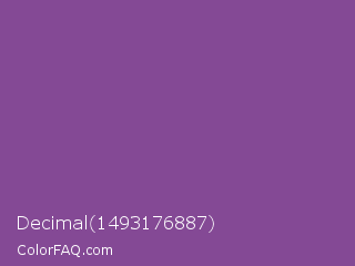 Decimal 1493176887 Color is a normal purple color and the nearest color is Dark Lavender #734f96. Hex code #844995 and RGB value is rgb(132,73,149). In RGB color space, this color is composed of 52% red, 29% green, 58% blue, In CMYK color space, this color is composed of 11% cyan, 51% magenta, 0% yellow , 42% black , In HSL color space, this color has a hue angle of 287° , 34% saturation and 44% lightness.