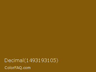 Decimal 1493193105 Color is a dark orange color and the nearest color is Rusty Nail #86560a. Hex code #845907 and RGB value is rgb(132,89,7). In RGB color space, this color is composed of 52% red, 35% green, 3% blue, In CMYK color space, this color is composed of 0% cyan, 33% magenta, 95% yellow , 48% black , In HSL color space, this color has a hue angle of 39° , 90% saturation and 27% lightness.