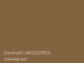 Decimal 1493202953 Color is a normal orange color and the nearest color is Raw Umber #826644. Hex code #846341 and RGB value is rgb(132,99,65). In RGB color space, this color is composed of 52% red, 39% green, 25% blue, In CMYK color space, this color is composed of 0% cyan, 25% magenta, 51% yellow , 48% black , In HSL color space, this color has a hue angle of 30° , 34% saturation and 39% lightness.