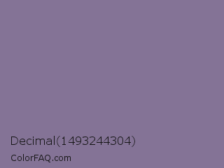 Decimal 1493244304 Color is a normal violet color and the nearest color is Waterloo #7b7c94. Hex code #847396 and RGB value is rgb(132,115,150). In RGB color space, this color is composed of 52% red, 45% green, 59% blue, In CMYK color space, this color is composed of 12% cyan, 23% magenta, 0% yellow , 41% black , In HSL color space, this color has a hue angle of 269° , 14% saturation and 52% lightness.