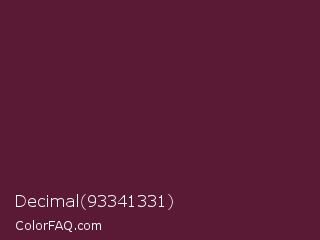 Decimal 93341331 Color is a dark rose color and the nearest color is Wine Berry #591d35. Hex code #5a1935 and RGB value is rgb(90,25,53). In RGB color space, this color is composed of 35% red, 10% green, 21% blue, In CMYK color space, this color is composed of 0% cyan, 72% magenta, 41% yellow , 65% black , In HSL color space, this color has a hue angle of 334° , 57% saturation and 23% lightness.