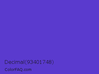 Decimal 93401748 Color is a normal indigo color and the nearest color is Iris #5a4fcf. Hex code #5a3ace and RGB value is rgb(90,58,206). In RGB color space, this color is composed of 35% red, 23% green, 81% blue, In CMYK color space, this color is composed of 56% cyan, 72% magenta, 0% yellow , 19% black , In HSL color space, this color has a hue angle of 253° , 60% saturation and 52% lightness.