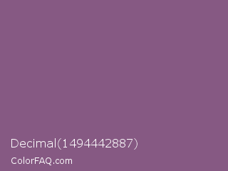 Decimal 1494442887 Color is a normal magenta color and the nearest color is Chinese Violet #856088. Hex code #865983 and RGB value is rgb(134,89,131). In RGB color space, this color is composed of 53% red, 35% green, 51% blue, In CMYK color space, this color is composed of 0% cyan, 34% magenta, 2% yellow , 47% black , In HSL color space, this color has a hue angle of 304° , 20% saturation and 44% lightness.