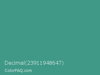 Decimal 23911948647 Color is a normal cyan color and the nearest color is Zomp #39a78e. Hex code #409987 and RGB value is rgb(64,153,135). In RGB color space, this color is composed of 25% red, 60% green, 53% blue, In CMYK color space, this color is composed of 58% cyan, 0% magenta, 12% yellow , 40% black , In HSL color space, this color has a hue angle of 168° , 41% saturation and 43% lightness.