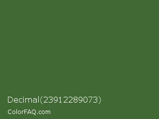Decimal 23912289073 Color is a normal green color and the nearest color is Hunter Green #355e3b. Hex code #416933 and RGB value is rgb(65,105,51). In RGB color space, this color is composed of 25% red, 41% green, 20% blue, In CMYK color space, this color is composed of 38% cyan, 0% magenta, 51% yellow , 59% black , In HSL color space, this color has a hue angle of 104° , 35% saturation and 31% lightness.