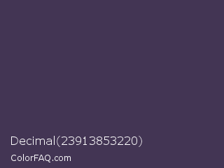Decimal 23913853220 Color is a dark violet color and the nearest color is Gun Powder #414257. Hex code #433554 and RGB value is rgb(67,53,84). In RGB color space, this color is composed of 26% red, 21% green, 33% blue, In CMYK color space, this color is composed of 20% cyan, 37% magenta, 0% yellow , 67% black , In HSL color space, this color has a hue angle of 267° , 23% saturation and 27% lightness.