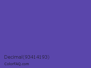 Decimal 93414193 Color is a normal indigo color and the nearest color is Plump Purple #5946b2. Hex code #5a46ab and RGB value is rgb(90,70,171). In RGB color space, this color is composed of 35% red, 27% green, 67% blue, In CMYK color space, this color is composed of 47% cyan, 59% magenta, 0% yellow , 33% black , In HSL color space, this color has a hue angle of 252° , 42% saturation and 47% lightness.