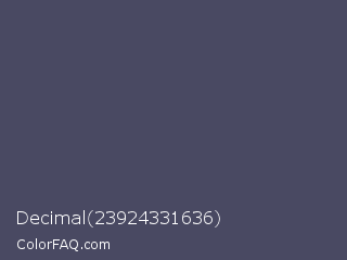 Decimal 23924331636 Color is a normal blue color and the nearest color is Mulled Wine #4e4562. Hex code #494962 and RGB value is rgb(73,73,98). In RGB color space, this color is composed of 29% red, 29% green, 38% blue, In CMYK color space, this color is composed of 26% cyan, 26% magenta, 0% yellow , 62% black , In HSL color space, this color has a hue angle of 240° , 15% saturation and 34% lightness.