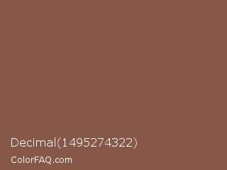 Decimal 1495274322 Color is a normal red color and the nearest color is Spicy Mix #885342. Hex code #875748 and RGB value is rgb(135,87,72). In RGB color space, this color is composed of 53% red, 34% green, 28% blue, In CMYK color space, this color is composed of 0% cyan, 36% magenta, 47% yellow , 47% black , In HSL color space, this color has a hue angle of 14° , 30% saturation and 41% lightness.