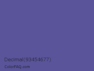 Decimal 93454677 Color is a normal indigo color and the nearest color is Butterfly Bush #624e9a. Hex code #5a559b and RGB value is rgb(90,85,155). In RGB color space, this color is composed of 35% red, 33% green, 61% blue, In CMYK color space, this color is composed of 42% cyan, 45% magenta, 0% yellow , 39% black , In HSL color space, this color has a hue angle of 244° , 29% saturation and 47% lightness.