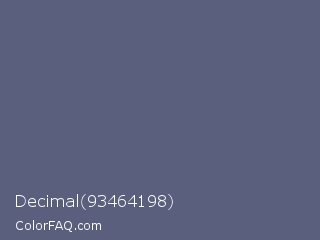 Decimal 93464198 Color is a normal blue color and the nearest color is Comet #5c5d75. Hex code #5a5f7e and RGB value is rgb(90,95,126). In RGB color space, this color is composed of 35% red, 37% green, 49% blue, In CMYK color space, this color is composed of 29% cyan, 25% magenta, 0% yellow , 51% black , In HSL color space, this color has a hue angle of 232° , 17% saturation and 42% lightness.