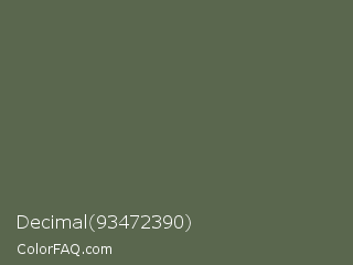 Decimal 93472390 Color is a normal green color and the nearest color is Finch #626649. Hex code #5a674e and RGB value is rgb(90,103,78). In RGB color space, this color is composed of 35% red, 40% green, 31% blue, In CMYK color space, this color is composed of 13% cyan, 0% magenta, 24% yellow , 60% black , In HSL color space, this color has a hue angle of 91° , 14% saturation and 35% lightness.